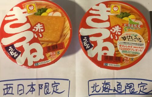 東洋水産の「赤いきつね」の 北海道限定版と西日本版、 この2つを入手したので食べ比べました (地域によって味が違う) うどんは地域によって好みの味が大きく違います。 同じように「マルちゃん赤いきつね」は 東西で違うバージョンが存在し、さらに関西限…