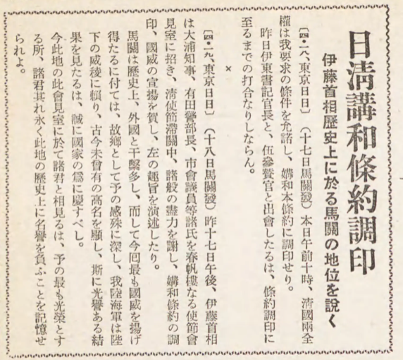 講和条約には日本全権伊藤博文・陸奥宗光と清国全権李鴻章が調印。