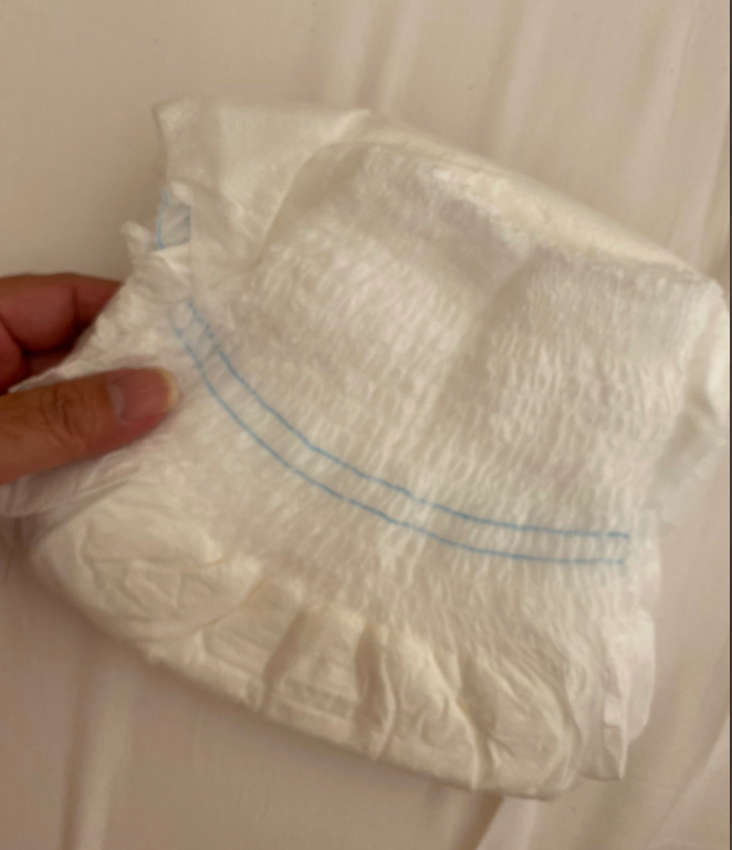 そして、歩いて分娩台に乗ります。紙パンツを下ろし、下半身はスッポンポンの状態で妊婦さんが出産するように股を大きく広げます。